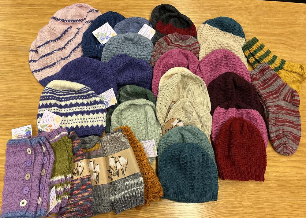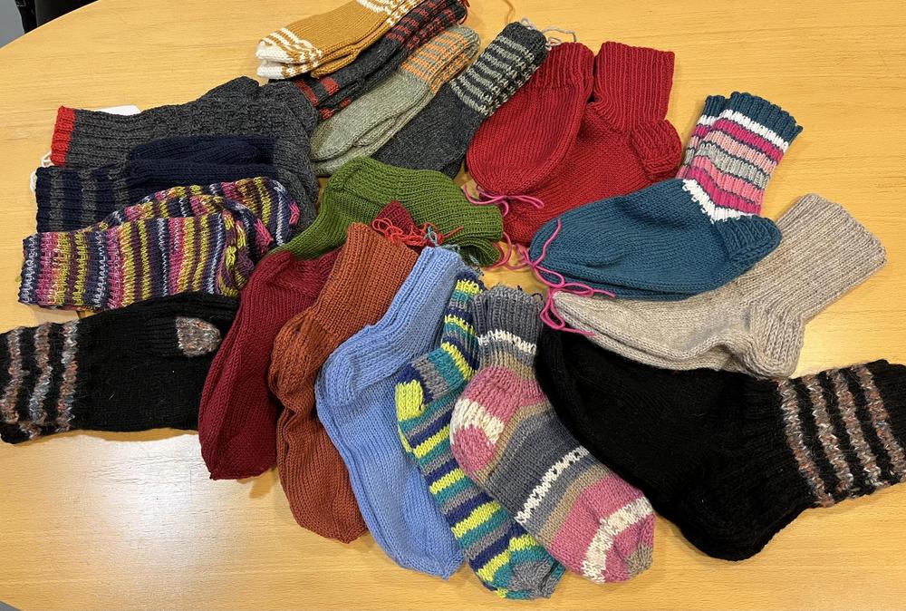 Käsityökerho osallistuu tänä syksynä 2024 valtakunnalliseen Lahjoita lämpöä-kampajaan neulomalla sukkia ja lapasia asunnottomille.