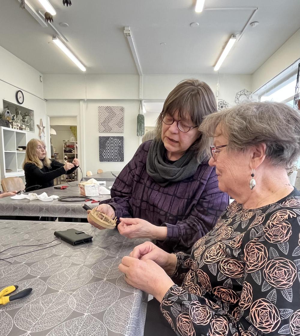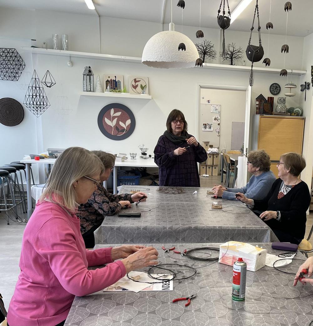 Käsityökerholaiset heittäytyivät uuden materiaalin kimppuun ja vaihtoivat villalangan rautalankaan Vaasan taitokeskuksen työpajassa.