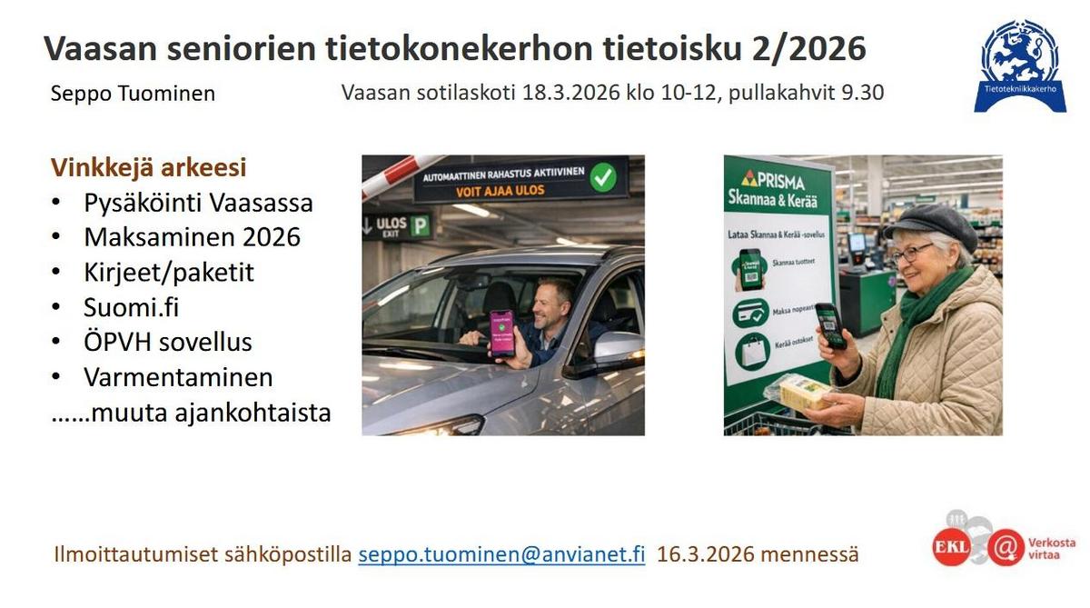 Tietotekniikkakerho järjesti ti 2.4.2019 klo 10:00-11:30 tietoiskun Vaasan pääkirjaston Draama -salissa. Kahvi-/teetarjoilu, tilaisuus maksuton.