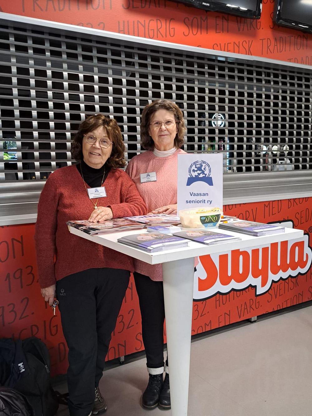 Vaasan seniorit esittelivät toimintaansa 6.-8.5. POHY:n H-talossa. Vapaaehtoisina esittelijöinä olivat kuvassa näkyvät 8.5. iltapäivävuorolaiset Ullariitta ja Riitta K. Muut vapaaehtoiset olivat Maija, Paula, Pertti, Riitta H, Synnöve, Vuokko K-vieri. Esittelyn oli organisoinut VIPS. Sihteerimme Riitta H oli suunnitellut ja koonnut materiaalimme.